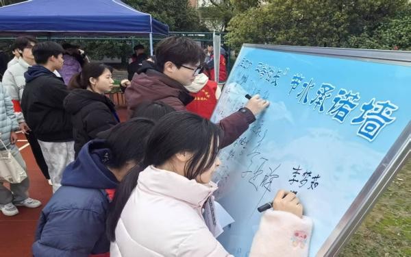 活动通过“水行动任务卡”串联起“科普介绍-净水处理-知识问答-承诺签名” 四个核心环节,构建了从知识到行动的完整链条。在科普介绍长廊,同学们深入了解“水与性别”议题及“国家水网”的战略意义;在净水处理环节,现场的青年志愿者特意从校园自来水龙头、直饮水点打来了水样,小心翼翼地送到检测台,和益阳市自来水有限公司的工作人员一起操作专业检测仪器,工作人员边操作边细致讲解:“大家喝的每一滴龙头水,都要经过沉淀、过滤、消毒等多道工序,来之不易。”上实环境(益阳城北)污水处理有限公司的工作人员也同步演示了污水处理的核心流程,让同学们真切感受到水资源循环利用的价值;在知识问答环节,益阳市疾病预防控制中心向同学们发放健康用水手册并开展问答互动,气氛欢快热烈;在承诺签名环节,师生们纷纷写下了关于校园用水设施与节水管理的建议便利贴,并在承诺墙签名,表达践行节水护水的决心。