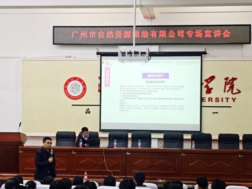座谈会后,袁国辉董事长一行前往信电楼多媒体教室,面向2026届测绘工程专业毕业生开展专场宣讲会。袁国辉首先与同学们亲切交流,他结合自身经历,分享了测绘地理信息行业的发展前景与人才需求,表达了对家乡学子的殷切期望,鼓励同学们夯实专业基础、紧跟行业前沿,在实践中锤炼本领。随后,公司党群人事纪检室副主任周凯围绕企业发展历程、核心业务、战略布局及人才成长体系等内容进行了系统介绍,并对招聘岗位、职业发展路径及薪酬待遇等作了详细说明,现场互动热烈。此次宣讲进一步搭建了校企人才对接的桥梁,为学生高质量就业拓宽了渠道。