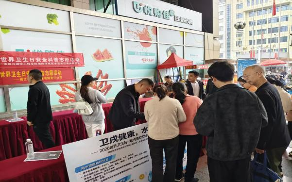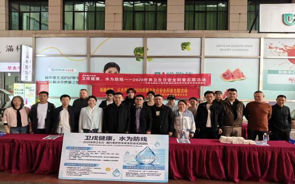 (通讯员 周俊 段淋康 陈子涵) 为深入贯彻落实《“健康中国2030”规划纲要》《健康湖南行动(2019-2030年)》相关要求,进一步提升公众水健康素养,牢固树立“自身健康第一责任人”的理念,在第77个世界卫生日来临之际,一场以“卫戍健康,水为防线”为主题的科普宣传活动在桃江县金碧财富广场温情启幕。本次活动由湖南城市学院市政与测绘工程学院、桃江县城市供水有限责任公司联合主办,市政与测绘工程学院“湘约清欢”饮水安全社会实践团队全程承办。活动以水健康科普为核心抓手,深化校地、校企协同联动,将专业的给排水知识转化为接地气、暖民心的健康服务,为桃江市民送上了一份实用又贴心的“水健康大礼包”,让科学用水、健康用水的理念深入人心。