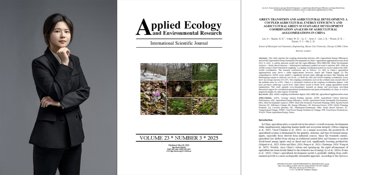 (通讯员 段姣姣)农业绿色转型是实现生态文明建设与可持续发展的重要路径。近日,我校市政与测绘工程学院本科生刘沙在该领域取得重要成果。其在本科学习阶段,开展了对中国农业集聚区绿色发展与能源效率耦合协调关系的系统分析研究。该成果以题为《Green Transition and Agricultural Development: A Coupled Agricultural Energy Efficiency and Agricultural Green Sustainable Development Coordination Analysis of Agricultural Agglomerations in China》的论文,发表于环境科学与生态学交叉领域SCI四区国际期刊《Applied Ecology and Environmental Research》,标志着我校在绿色低碳研究方面取得了又一突破。