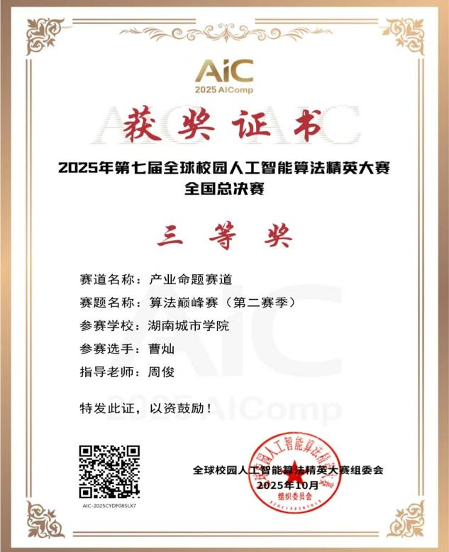 (通讯员 周俊 曹灿)2025年8月28日-10月12日,第七届“全球校园人工智能算法精英大赛”产业命题赛道·算法巅峰赛在线上举行,市政与测绘工程学院2023级给排水科学与工程专业(新工科实验班)曹灿同学在周俊老师指导下积极参赛,沉着应战,与清华大学、悉尼大学、山东大学等国内外100多家高校380多名本科生共同竞技中脱颖而出,荣获国家级三等奖,实现了我校在该项高水平人工智能算法竞赛中历史性突破。同时曹灿同学以算法为基石,再接再厉,在2025年11月12日荣获全国大学生数学建模竞赛省级二等奖。
