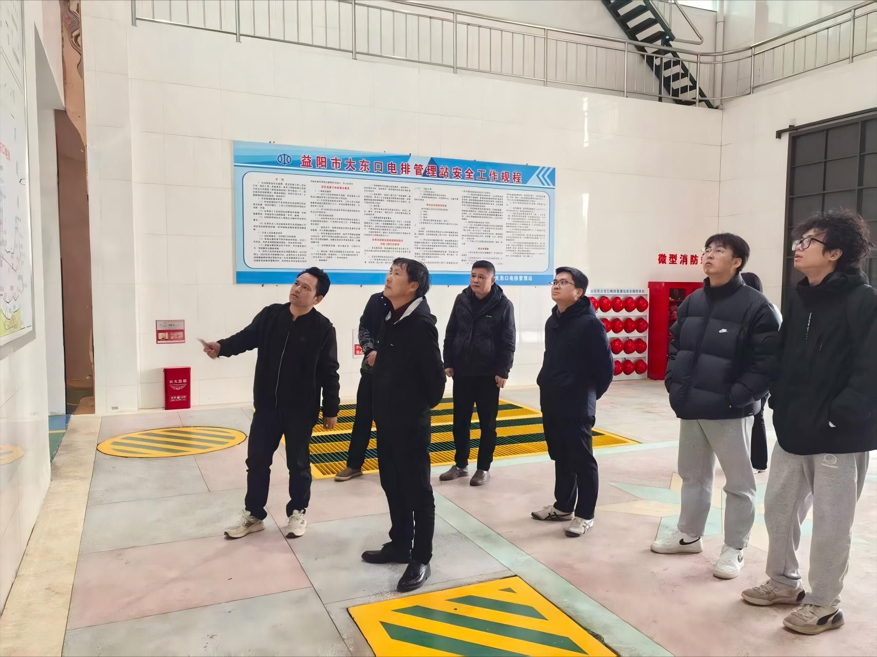 在明山电排管理站负责人的陪同下,池年平一行先后前往位于大通湖区的大东口电排、位于南县的明山电排,实地参观了泵站中控室、机组设备区、防汛调度中心等核心区域,通过现场观摩及技术人员专业讲解,详细了解了两处泵站的建设规模、核心技术参数、日常运行机制以及在区域防汛排涝、水资源优化调配中的核心作用。池年平院长全面了解了泵站智能化运维水平、高效应急处置的相关情况,高度评价其在保障大通湖垸民生安全中展现的责任担当。