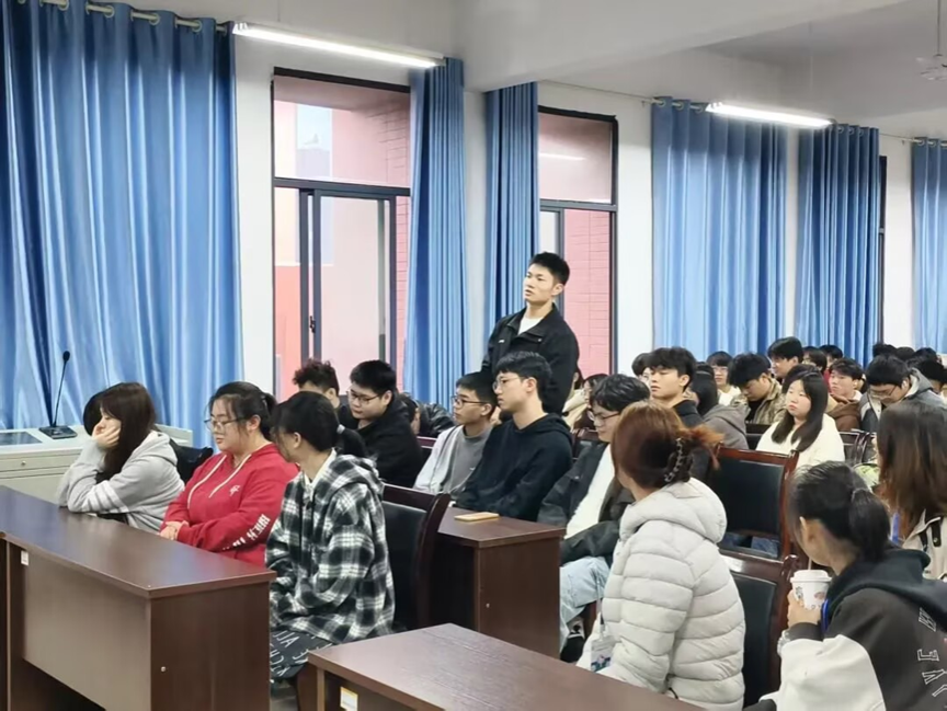 互动环节气氛热烈,同学们踊跃提问,就专业困惑、学业规划及未来职业挑战等问题与学长进行了深入交流。蒋开国校友耐心细致地一一解答,以其睿智的见解和真诚的态度赢得了阵阵掌声。最后,一名学生代表走上讲台,向蒋开国校友敬献鲜花,以表达全体师生对其倾情分享的诚挚感谢与崇高敬意,温馨感人的场面将活动推向高潮。